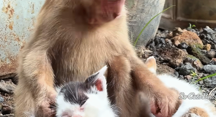 In a quiet corner of a small village, where sunlight filters softly through old banana trees and the sound of birds fills the morning air, an unlikely friendship began to bloom. It was the friendship between a baby monkey and two tiny kittens — a friendship so pure, so innocent, that everyone who saw it couldn’t help but smile.