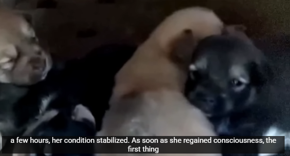 The puppies were placed beside her, squeaking softly. Despite her pain, Luna tried to lift her head. Her tongue moved, licking each one of them in turn. Her breathing grew ragged, but her eyes were calm. She had done her duty — she had brought help to her babies.