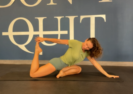 Sitting on the mat, I extend one leg and fold over it slowly, reaching toward my toes. It’s not about touching them — it’s about breathing into the tightness and allowing the muscle to soften.