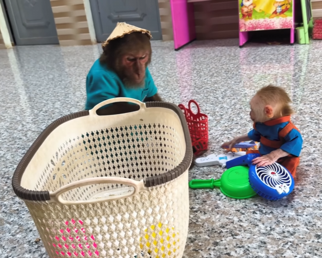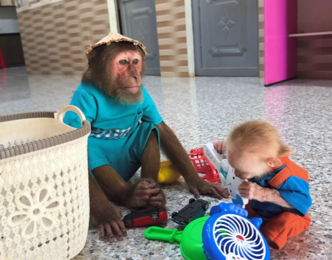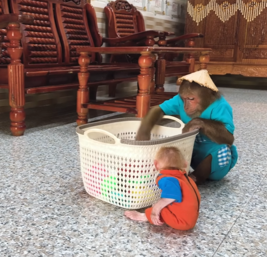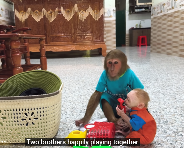Miko reached over and patted Cutis’s head with his tiny hands, chattering happily. Then he did something that made everyone laugh — he picked up the banana he had dropped earlier, broke it in half, and gave one piece to Cutis.