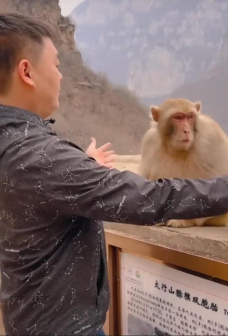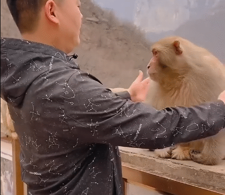 The Monkey King looked down, eyes softening. He made a gentle sound, almost like a purr. Then, in a gesture that shocked everyone, he climbed down, took a banana from Mr. Kuang’s hand, and placed his tiny paw gently on the man’s shoulder.