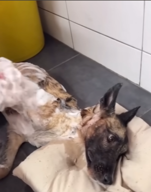The night was quiet, broken only by the soft whisper of the wind and the distant hum of passing vehicles. Under the dim light of a streetlamp, a frail figure lay trembling beside a trash bin — a small dog, her ribs visible beneath her thin, dirt-caked fur. Her eyes, once full of curiosity and life, now reflected only pain and desperation.