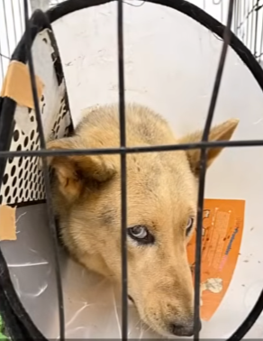 Her fur was filthy, clumped with dirt and fleas. Her ribs were showing, her tail motionless. The moment the light hit her face, she squinted and whimpered, backing away in fear.
