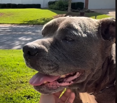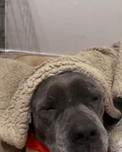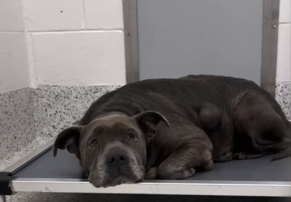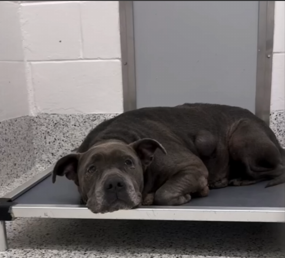 At the back of a noisy shelter market, where young, energetic puppies bounced inside their cages and wagged their tails eagerly at passersby, sat a gray-muzzled pit bull named Rusty. His body was strong once — powerful, full of life — but now, time had slowed him down. His fur had dulled, scars marked his past, and his eyes carried a deep sadness that no one seemed to notice anymore.
