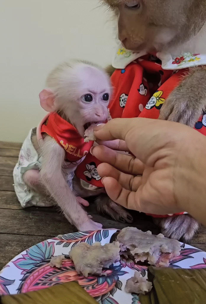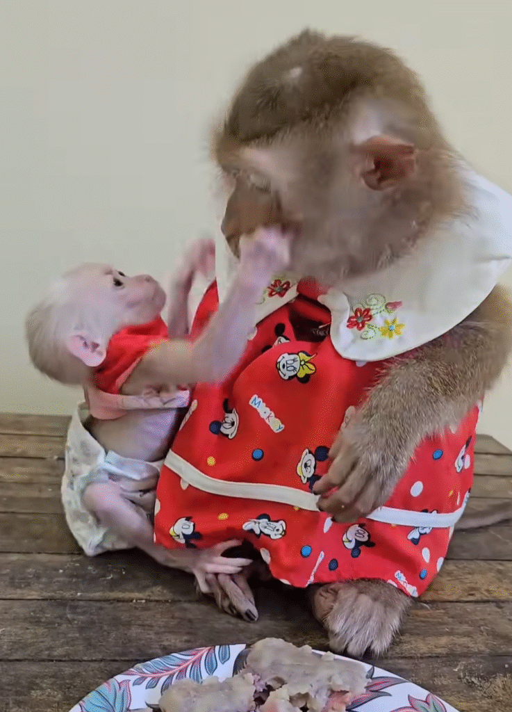 One afternoon, the caregivers placed a basket of fruit near the play area. Jack immediately reached for the juiciest mango, but before he could grab it, Liza tapped his hand gently. She broke the mango into smaller pieces and shared it with two younger monkeys. Jack frowned for a moment but then understood. Liza was teaching him kindness and sharing—lessons only a mother could teach.
