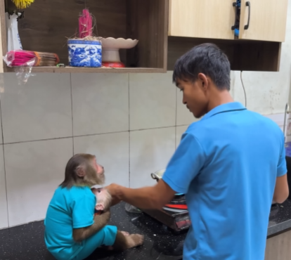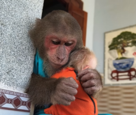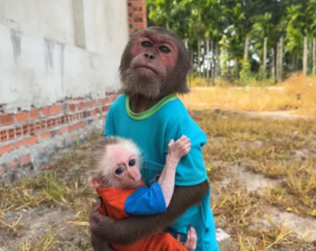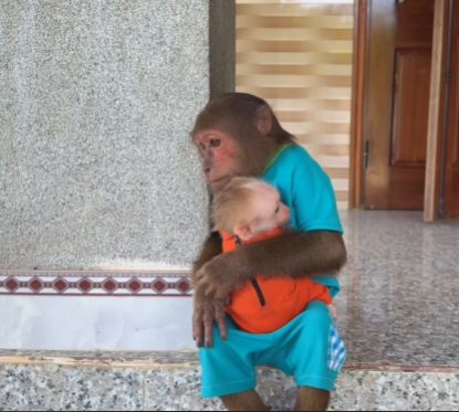 Baby monkey shook his head fiercely. “No! No, no! Please don’t go!” He clung tighter, wrapping his little arms around his dad’s neck. CUTIS joined him, tears falling silently as he hugged his father’s arm.