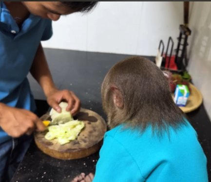 As days passed, they tried to be brave. CUTIS made sure baby monkey ate enough, played games to make him laugh, and watched the horizon every evening. Baby monkey started helping with chores — gathering fruit, sweeping leaves — though he often stopped, staring into the distance with a quiet sigh.