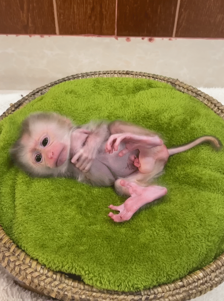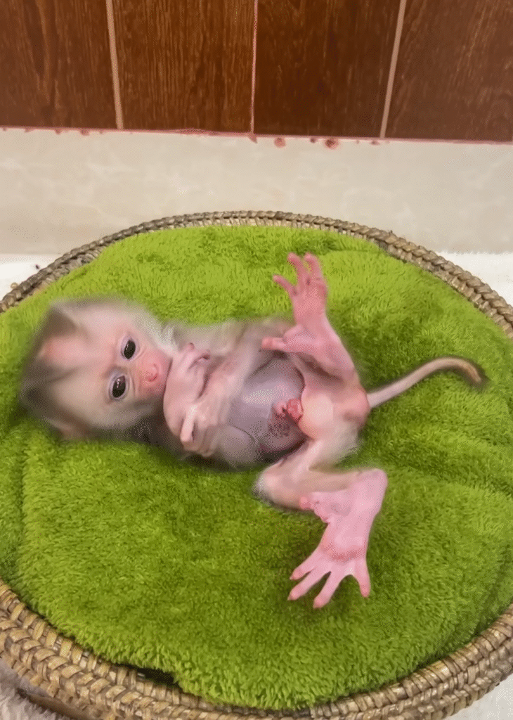 The baby monkey was no bigger than a teacup. Her eyes were closed tightly, her tiny fingers clutched at the air, and her fur was so thin it looked like a soft mist over her pink skin. Lina gasped softly, wrapping the fragile creature in a piece of warm cloth. “Oh, you poor little thing,” she whispered. “You’re the smallest baby I’ve ever seen.”