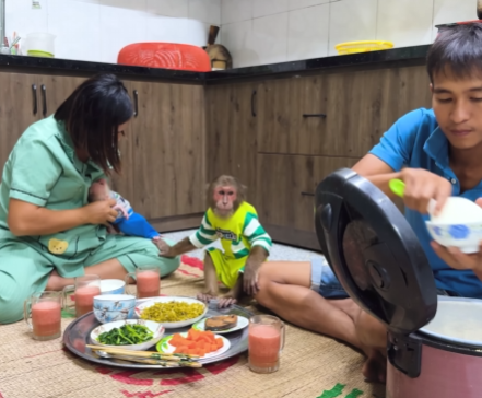 From the nearby tree, baby monkey peeked down, rubbing his eyes. “Huh? Cook? You? Since when do monkeys cook?”