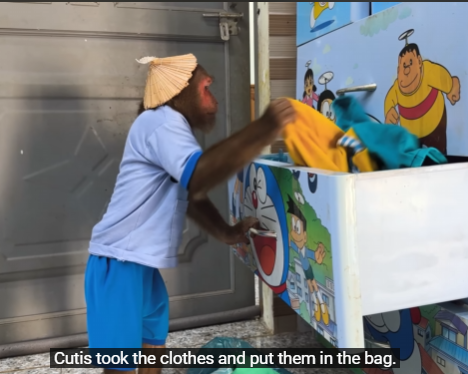 But CUTIS was already marching away with exaggerated steps, carrying a leaf bag on his shoulder. “Goodbye, cruel jungle! I’ll find a new home where monkeys are appreciated for their talents!”