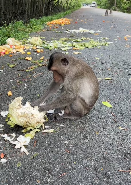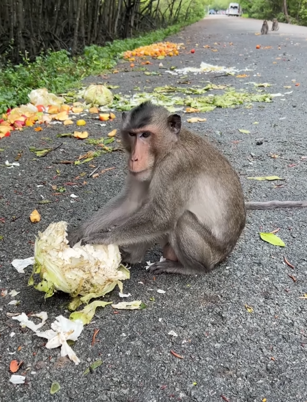 Other monkeys in the troop, inspired by Coco, began experimenting as well. Some tried eating it again, realizing that while it wasn’t as sweet as bananas, it could be chewed and manipulated in amusing ways. Others used it in playful tricks — hiding it, tossing it, or pretending it was a ball. The jungle, once a quiet scene of morning foraging, had transformed into a stage for one of the funniest games of the season. Coco, of course, remained the star of the show, squeaking with delight every time his cabbage stunts succeeded.