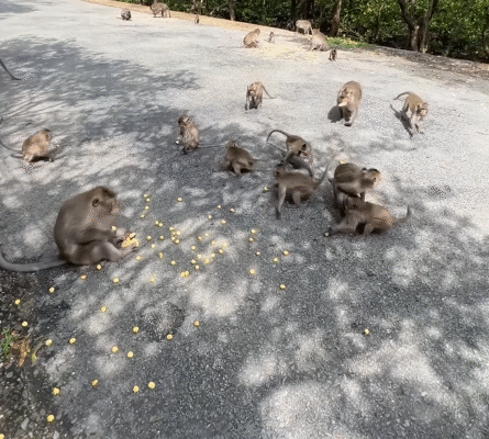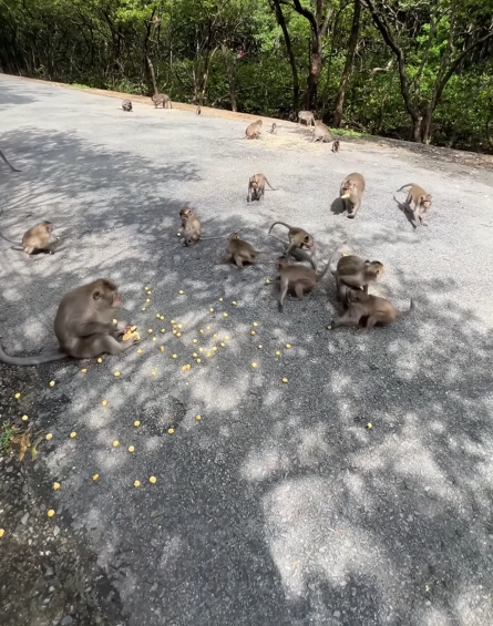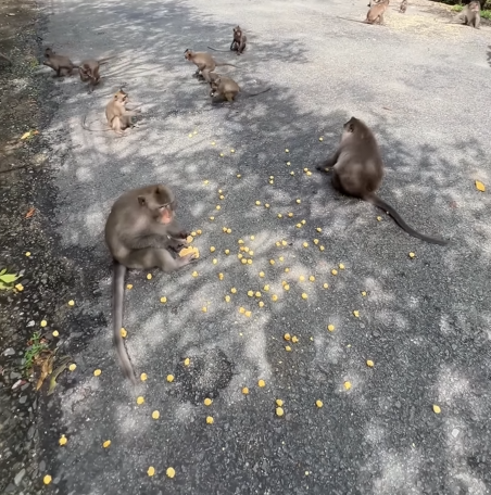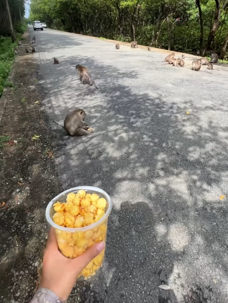 What followed was a scene of pure hilarity. Monkeys leapt from branch to branch, landing perfectly near the scattered popcorn, snatching pieces with their clever little hands, and squeaking excitedly. Some tossed kernels into the air, catching them expertly in their mouths. Others dropped popcorn accidentally, only to chase it in a frantic, comical scramble. Every movement was filled with energy, playfulness, and a touch of chaos.