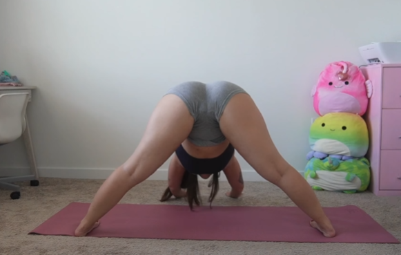 From there, slowly walk your feet toward your hands and hang in a forward fold. Let gravity do the work as you release the back of your body. If your hamstrings are tight, bend your knees slightly. You can hold opposite elbows and gently sway side to side. Feel the deep stretch travel through your legs and spine.