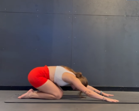 Take a deep inhale as you lift your chest and gaze upward. You’ll feel a gentle stretch in your hip flexors and spine — a perfect counter to hours of sitting.