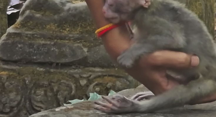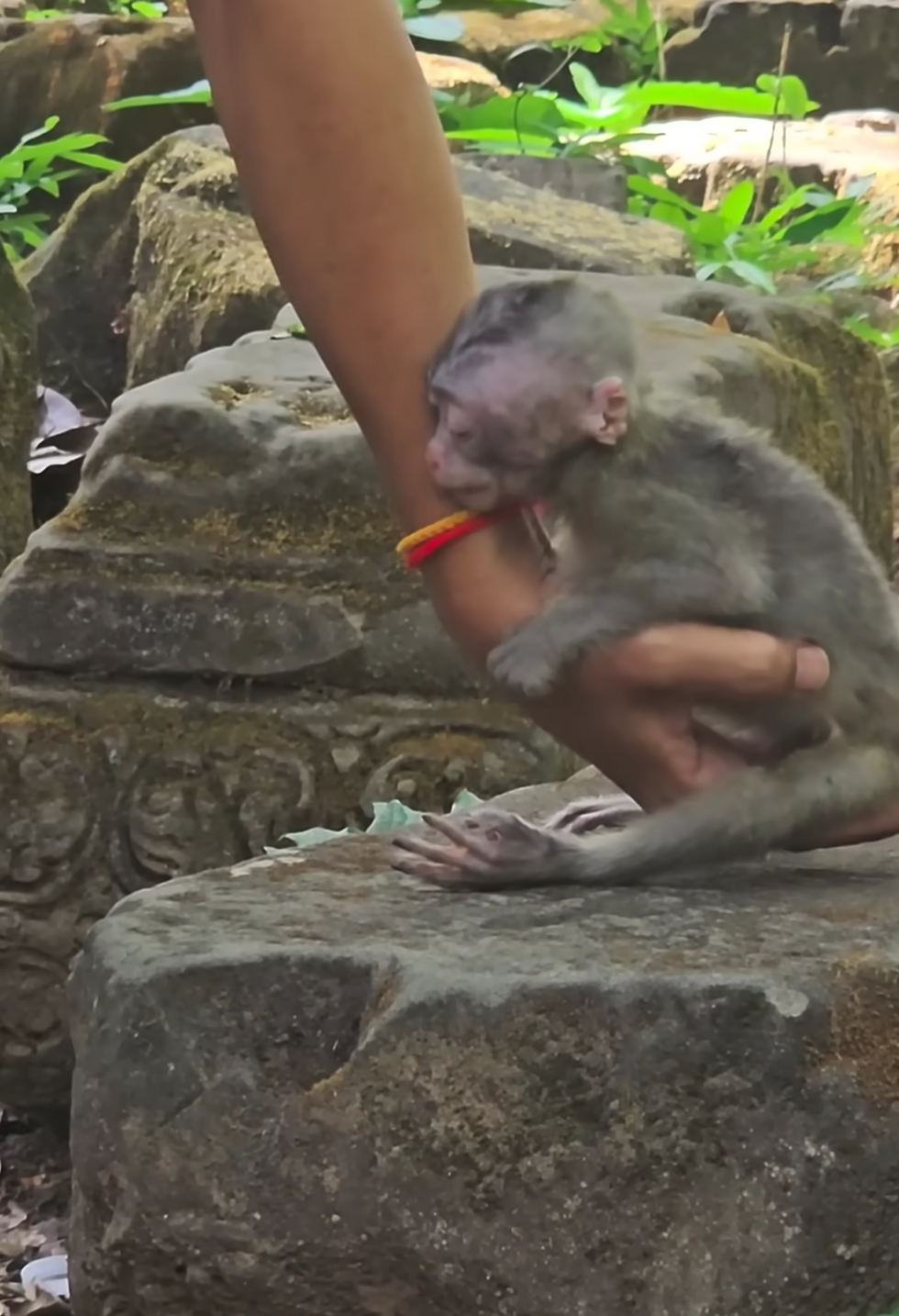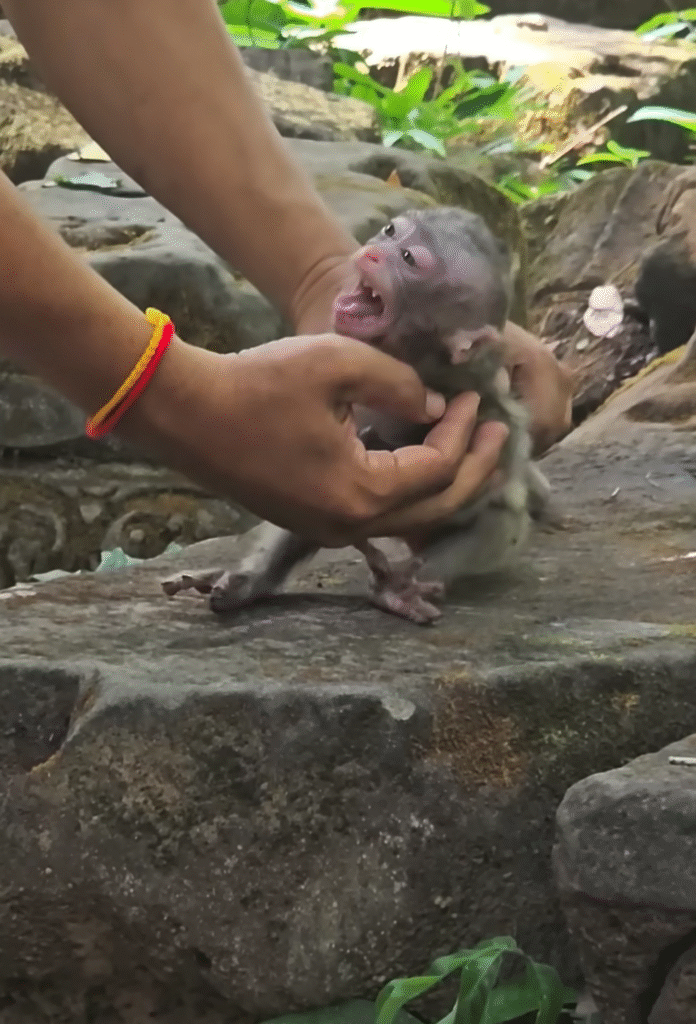 He moved closer, inch by inch, making sure not to startle the baby. When his fingers finally touched the monkey’s soft fur, the little one flinched and let out a loud cry—high-pitched and full of fear. It twisted its tiny body, trying to escape. Its mouth opened wide as if calling again for its missing mother.