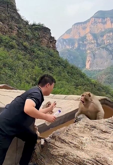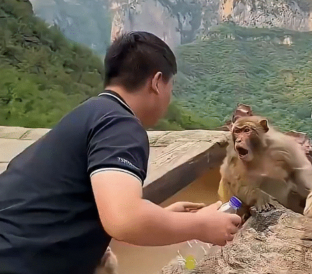 Of course, that encouraged the others. Within seconds, I was surrounded by monkeys armed with bottles, all splashing me with the remaining water. It was chaos β water flying everywhere, monkeys screaming with laughter, and me standing there soaked but unable to stop laughing. π