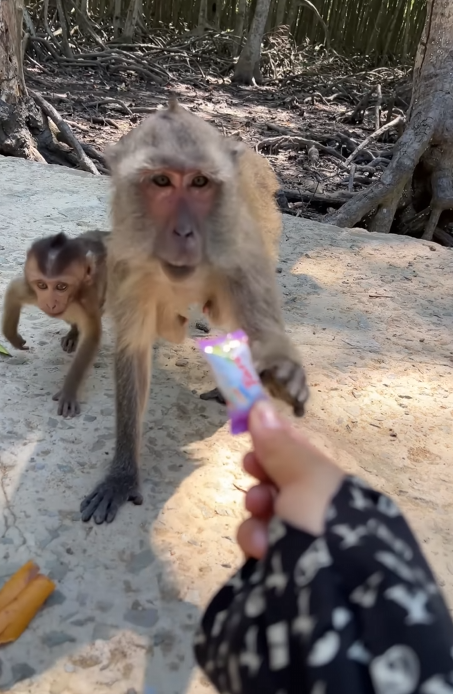 Then came the most hilarious moment of all — CUTIS decided to “share” his jelly in a completely ridiculous way. He scooped a spoonful and tossed it to Baby Monkey… but missed. The jelly flew high into the air and landed on Baby Monkey’s head.