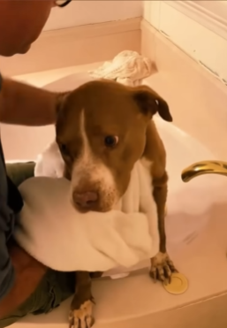 I extended a hand slowly, letting her sniff me first. Her nose, wet and cool, pressed against my fingers, and I could feel the shiver that ran through her tiny, frail body. She trembled, not with aggression, but with the weight of years of fear and longing. I whispered again, “It’s okay… you’re safe now.”