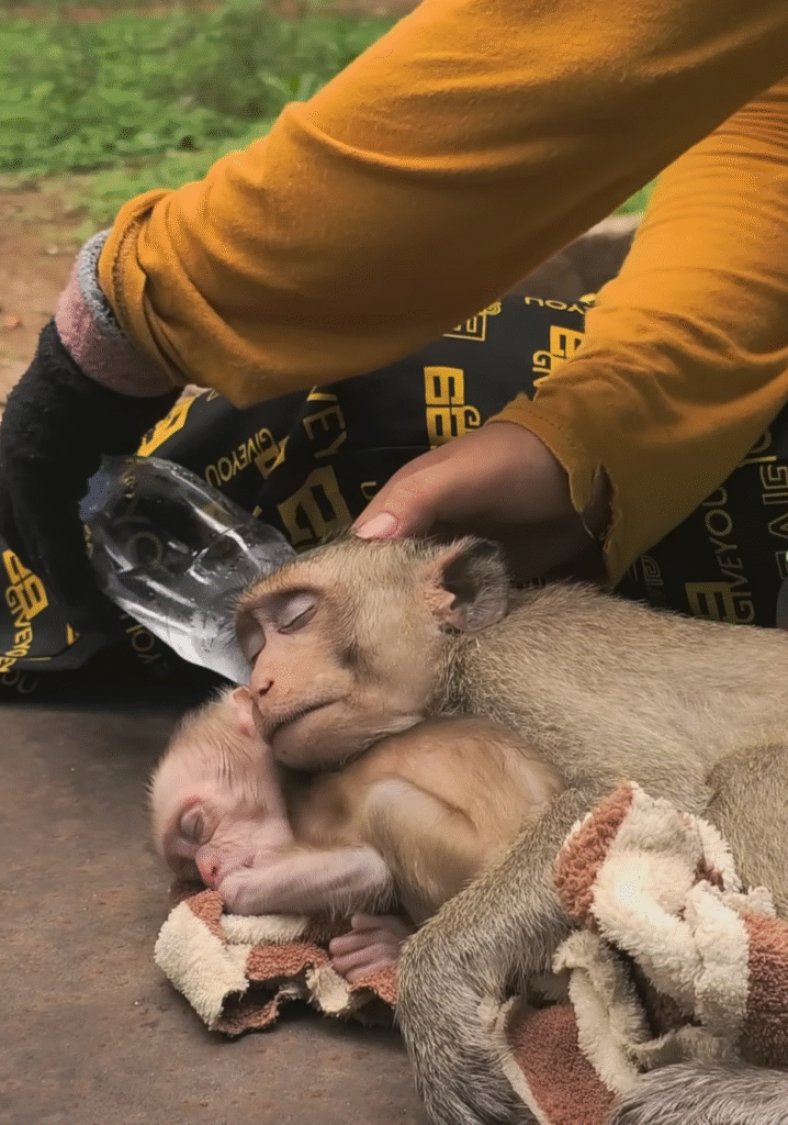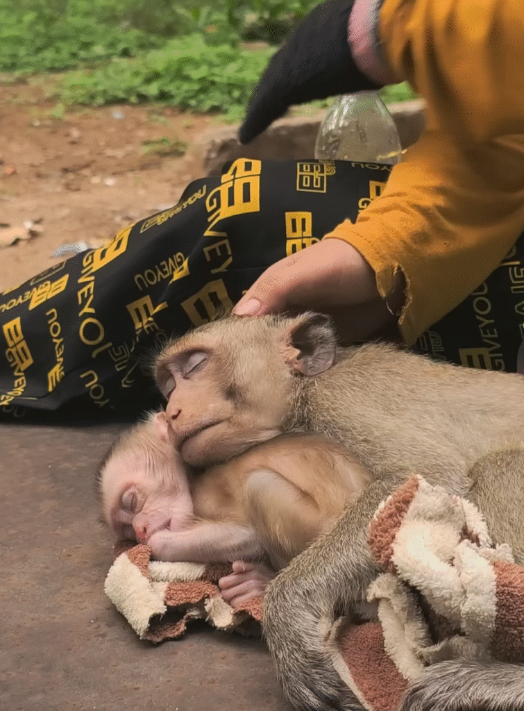 The forest was quiet that afternoon, bathed in the soft glow of the setting sun. The leaves swayed gently, and the air carried the sweet scent of wildflowers. In a small clearing beneath a large tree, a tender and heartwarming sight unfolded — a mother monkey cuddling her tiny baby close to her chest. Their peaceful slumber, wrapped in love and warmth, was a picture of pure affection that could melt any heart.