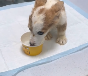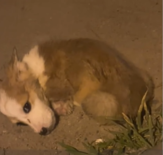 A puppy—a tiny, frail puppy with a swollen belly—lay motionless on the cold concrete. His fur was dirty and matted, his ribs visible even beneath the unnatural roundness of his stomach. Each breath he took came with a weak cough, his small body trembling from the cold.