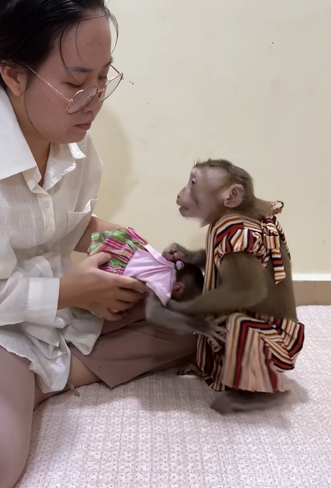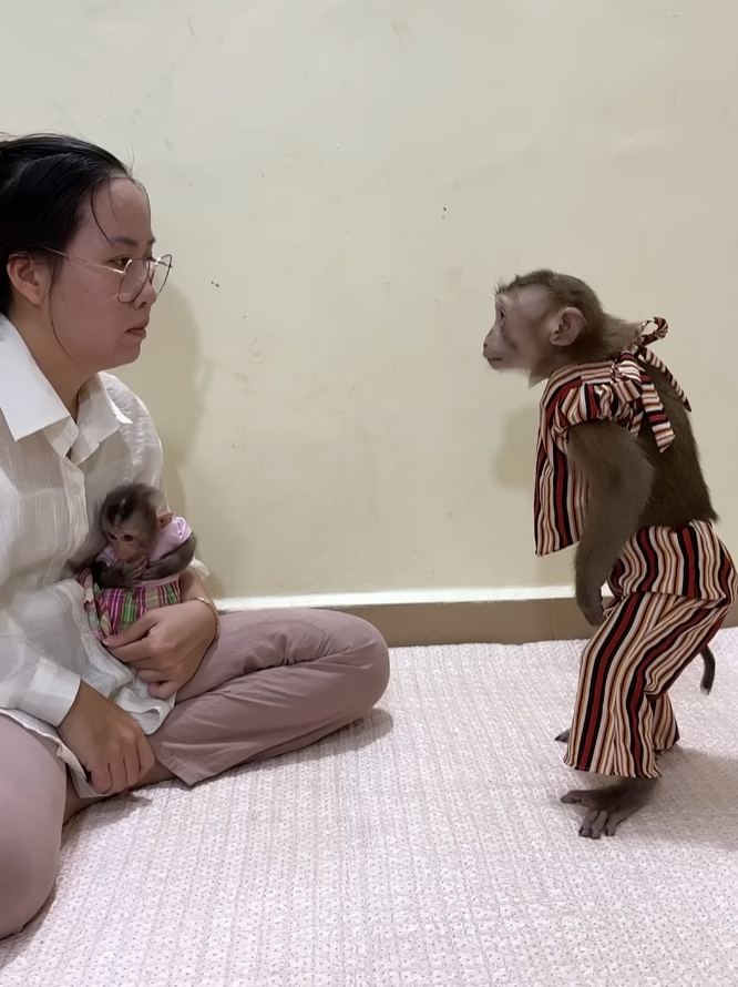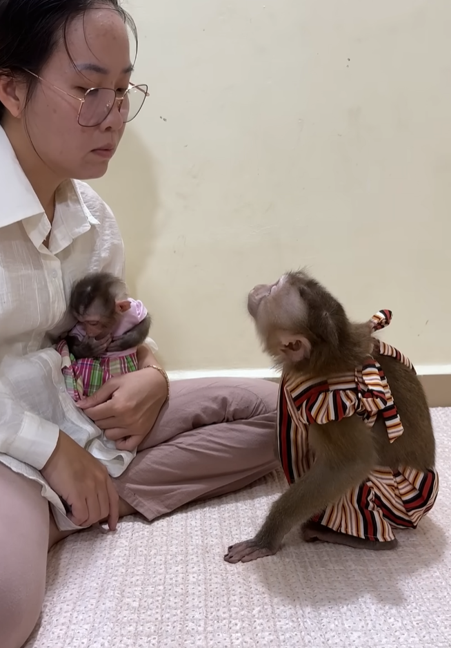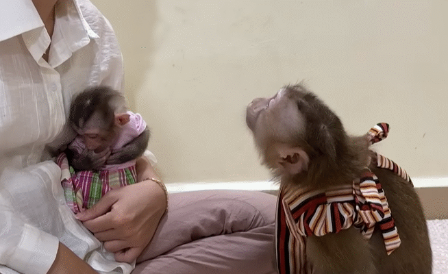 With Maya’s permission, Queen Jenny gently lifted Baby Linda. Her movements were slow and careful, so Linda wouldn’t feel startled. The baby monkey relaxed instantly in Jenny’s hands, letting out a tiny sigh.