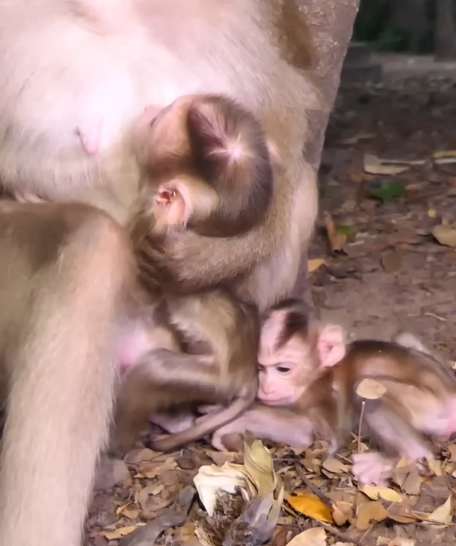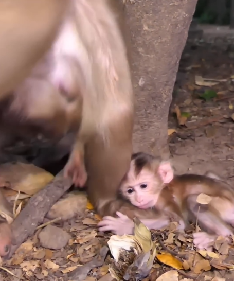 Imagine the early morning when sunlight first spills through the trees, painting the forest in shades of gold. The world is waking up, slow and gentle, and the air is cool enough to carry the dew’s freshness. In the middle of this peaceful scene sits a mother monkey, cradling her little one close to her chest. The baby monkey is barely a few weeks old—its fur still soft like silk, its eyes large and bright with curiosity.