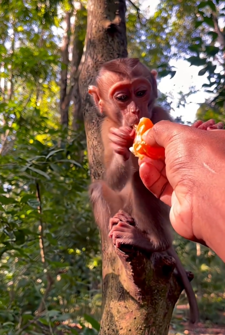 After a little tumble, Coco decided it was time for breakfast. Tiny hands reached for the juiciest berries hanging from a nearby bush. With each bite, Coco made exaggerated little chewing motions, smacking lips and squeaking with delight. “Mmm… so tasty!” Coco squeaked. The way Coco’s tiny face scrunched up in concentration and joy was so irresistibly cute that even the most stoic jungle residents paused to watch. A little bird perched nearby, tilting its head as if saying, “Wow… that’s unfair, this level of cuteness.”