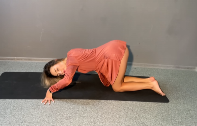She shifted into Cat-Cow, placing her hands under her shoulders, knees under her hips. As she inhaled, her belly dropped and her chest opened wide. As she exhaled, her spine rounded and her chin tucked inward.