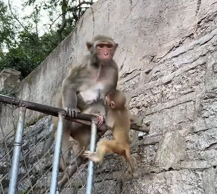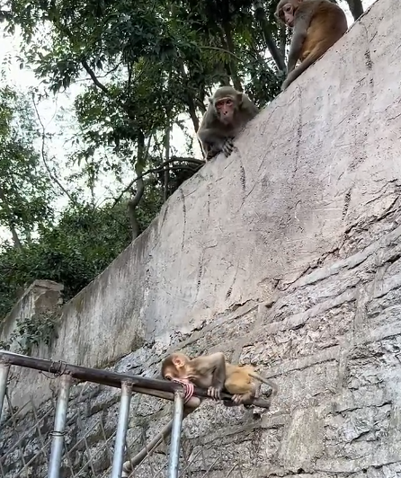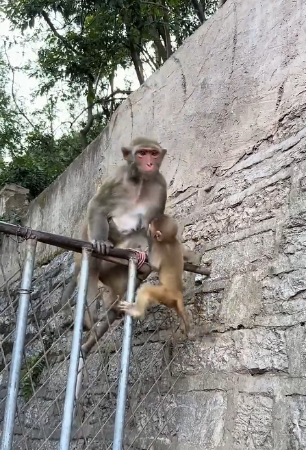 After a few moments of rest, the mother monkey hoisted her little one onto her back. The baby nestled against her neck, feeling safe and secure as they began the journey home.