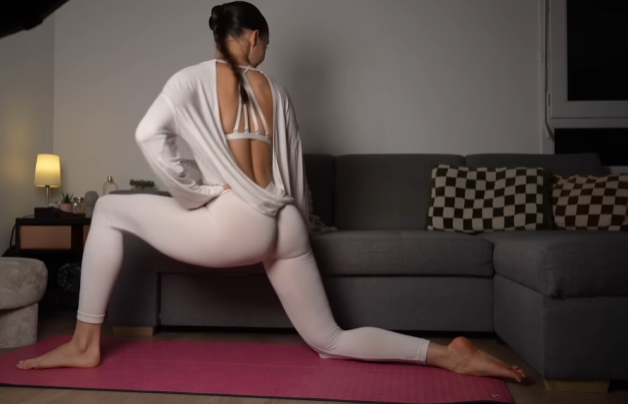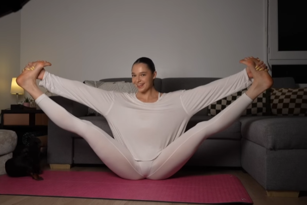 The morning sun filtered softly through the sheer curtains of Mirracle’s small but cozy yoga studio, painting warm stripes across the wooden floor. It was the kind of sunrise that made the world feel gentle, the kind that invited deep breaths, long stretches, and calm intention. Mirracle rolled out her favorite lavender-colored mat and placed her water bottle nearby. Today’s focus: middle split training. Deep, slow, challenging — exactly the type of session she loved.