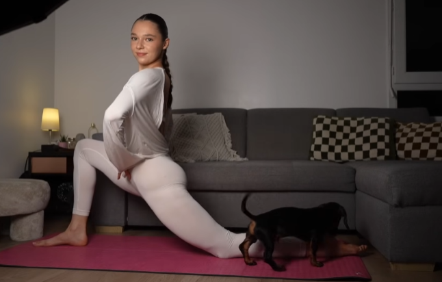 From the hallway came the pitter-patter of tiny paws, followed by a soft, excited whine. Before Mirracle could even lower into her first warm-up stretch, a small golden dog — her clingy little helper, Sunny — bounded into the room with the confidence of someone who believed they co-owned the space.