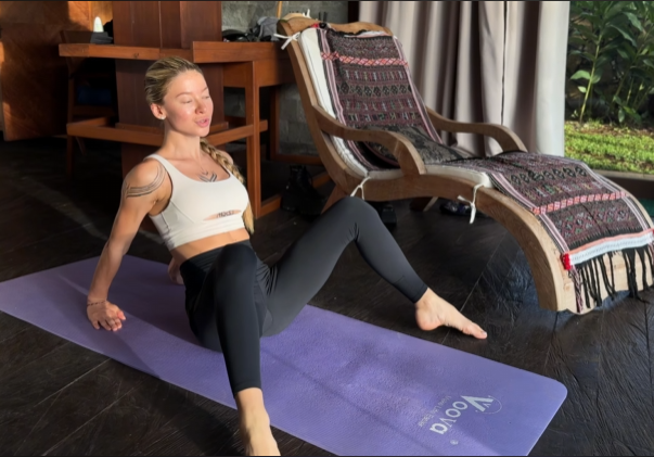 Return to a seated position for a figure-four stretch. Cross your right ankle over your left knee and gently pull your legs toward your chest. You will feel a deep opening in the glutes and outer hip. These muscles play a major role in posture and stability, so releasing them brings tremendous relief.