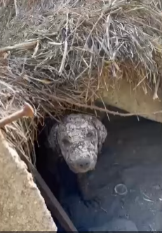Peering down, I saw her—a small, trembling dog, fur matted with grime, eyes wide with fear. She was crouched in the shadows, pressed against the cold, wet walls, as if the darkness itself could protect her. Her ribs were visible through her thin, filthy coat, and she shivered uncontrollably.