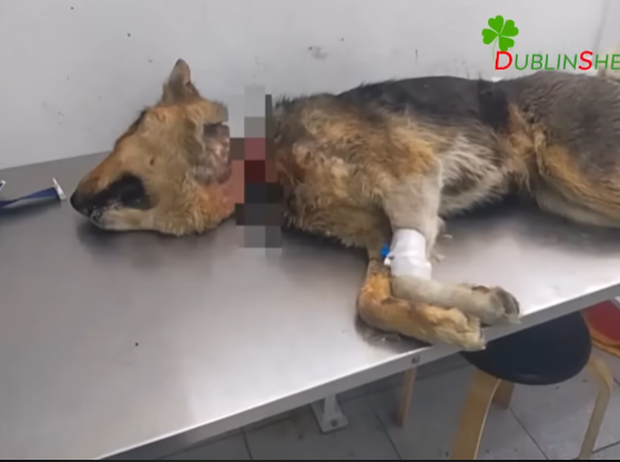 In a quiet, forgotten corner of an old neighborhood, beneath a collapsed fence and a cluster of abandoned crates, a small dog lay trembling. Her body was thin, her fur rough and dull, but it was her face—swollen, distorted, and painful—that made anyone who saw her take a step back in shock. A thick rope, frayed and filthy, was wrapped so tightly around her neck that it had cut deeply into the skin, leaving only a tiny passage for air. She had been tied there for so long that her face had puffed outward like a balloon.