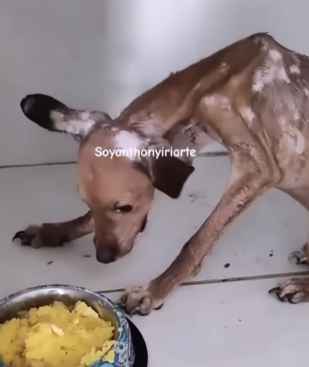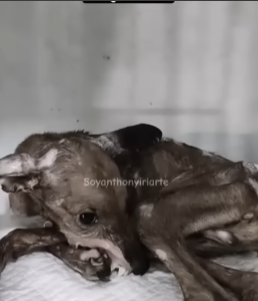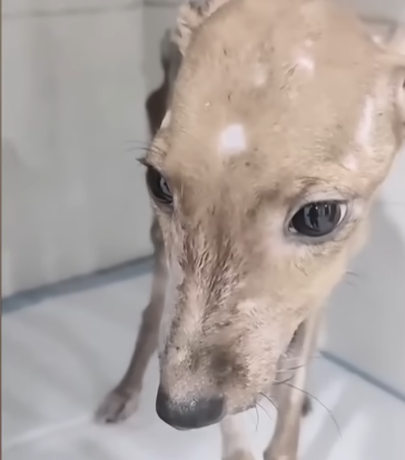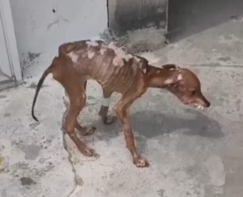 He was nothing but skin and bones, a fragile scrap of life barely strong enough to hold himself upright. His fur clung to his body like a soaked cloth, and every rib stood out beneath the thin, shivering skin. His eyes—large, pleading, desperate—were fixed on the wooden door in front of him.