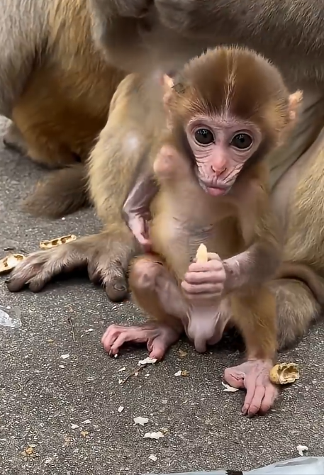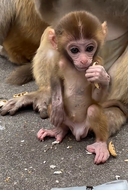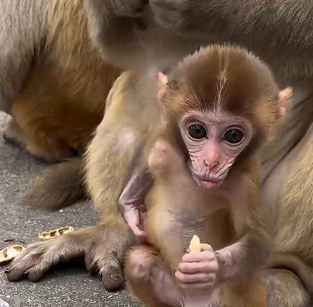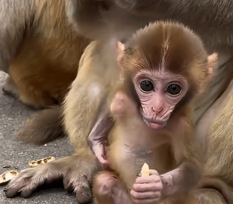 Then came the genius moment. Miko, from her vantage point above, had noticed a small lever on the underside of the box—a part that the humans had overlooked completely. With a precise flick of her nimble fingers, she pushed it, and the latch clicked open. Bananas tumbled out, and the younger monkeys squealed with delight, rushing to grab the sweet prize. The humans were astonished, snapping photos and exclaiming at the “incredible intelligence” of the troop. They had no idea that it was Miko who had orchestrated the entire event.
