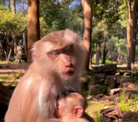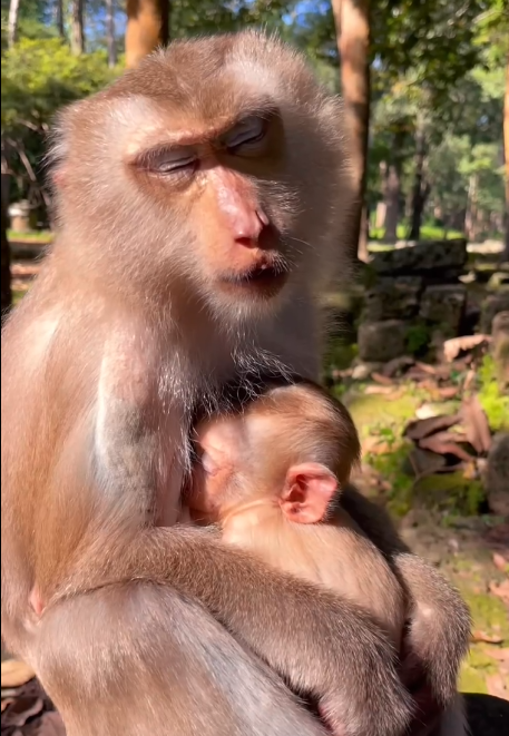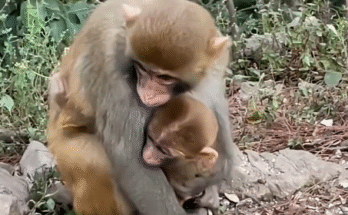 The morning sun filtered gently through the leaves, casting soft golden rays across the small clearing in the forest. It was a quiet, peaceful place, filled with the sweet scent of blooming flowers, the distant chatter of birds, and the gentle rustle of leaves in the breeze. Amidst this natural tranquility sat Mama Joyce, a mother monkey with fur the color of warm chestnut, cradling her baby, Jacee, in her arms. The sunlight danced across her fur and Jacee’s tiny, curious face, creating a scene of serenity and tenderness.