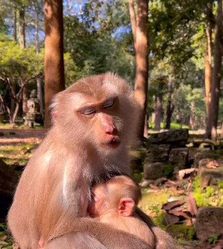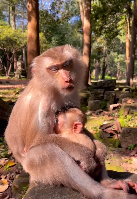 Time seemed to slow as the morning unfolded. Jacee finished nursing, his tiny body relaxed, eyes half-closed in contentment. Mama Joyce cradled him against her chest, rocking gently in the warmth of the sun. The baby’s tiny sighs of satisfaction blended with the soft rustling of the leaves, creating a serene symphony that mirrored the tranquility of the forest.