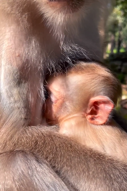 Jacee, no more than a few months old, looked up at his mother with wide, trusting eyes. His tiny hands clutched at her fur as he nuzzled close, feeling the warmth and protection of her body. Mama Joyce held him gently, supporting his small frame as he latched on to nurse. The act was simple yet profound, a bond between mother and child that required no words, only trust, instinct, and love.