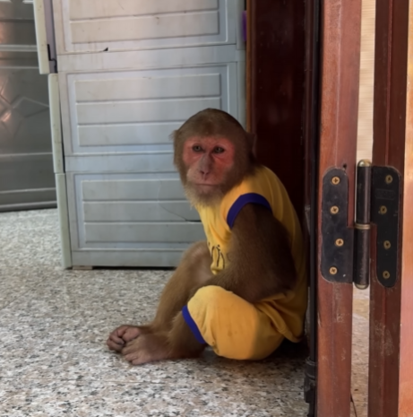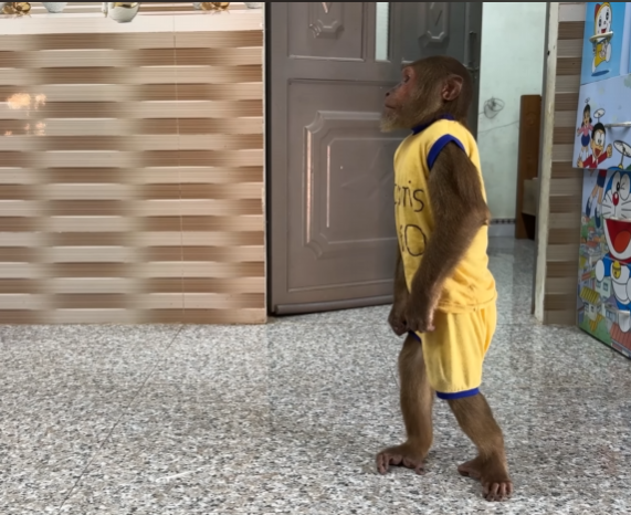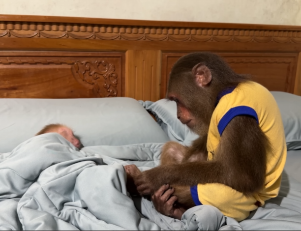 Dad knelt down, brushing a stray strand of fur from Baby Monkey’s forehead. His eyes, warm and steady, met his son’s pleading gaze. “I have to go, little one,” Dad said softly. “But I’ll come back soon. I promise.”