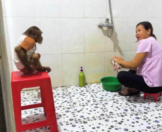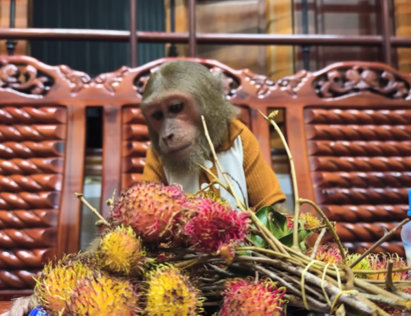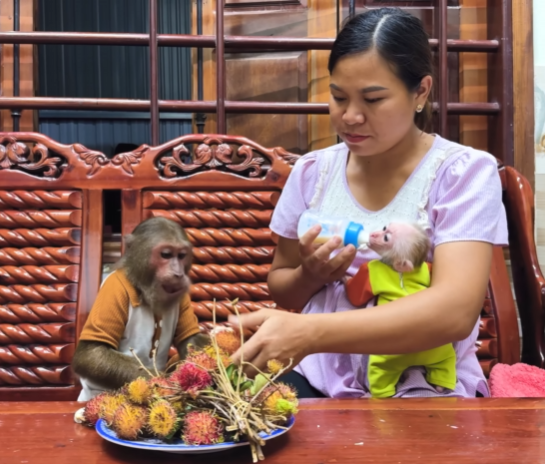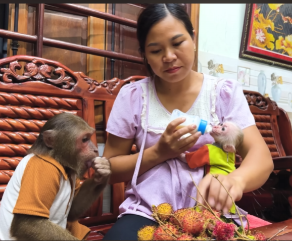 Mom looked up, her eyes widening in surprise. She blinked, unsure if she had seen correctly. “CUTIS… did you… bring these for me?” she asked, her voice a mixture of astonishment and delight. CUTIS nodded proudly, a mischievous grin spreading across his face. Baby Monkey clapped his tiny hands in excitement, squealing with joy.