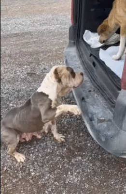 A dog—thin, trembling, and painfully starved—stood on shaky legs beside my open door. Her ribs were visible beneath her dirty fur, her eyes sunken yet pleading, begging for someone to notice her. She stepped closer, sniffed the air as if checking whether I was safe, then gently lifted one paw onto the edge of the seat.