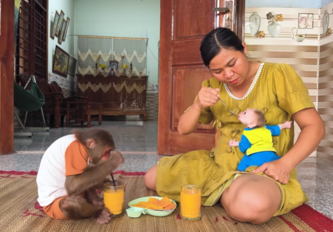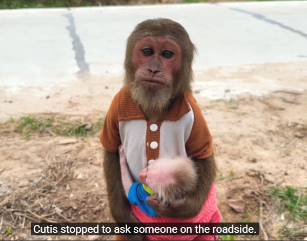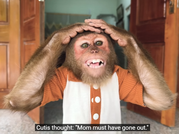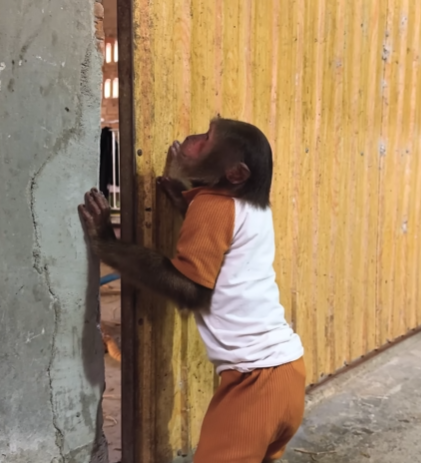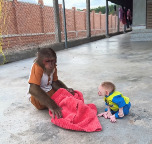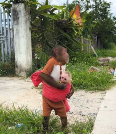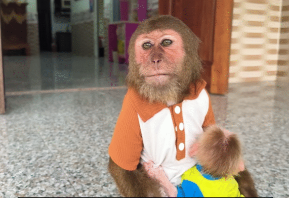 Baby Monkey followed, copying CUTIS like he always did. When Mom groaned again, the little one nearly burst into tears. He grabbed onto CUTIS’s chest, confused, scared, unsure of why the world suddenly felt so different.