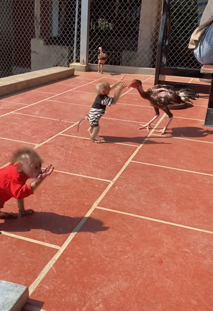 By the end of the day, Lele wrapped his arms gently around the rooster’s wing in a little monkey hug. The rooster stood still, accepting it like a true gentleman. No teasing. No mischief. Just warm, sweet friendship.