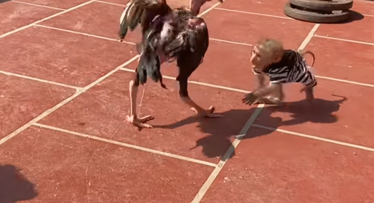 The rooster took two quick steps toward Lele, but the baby monkey hopped away fast, climbing onto a low branch where the rooster couldn’t reach. Lele stuck his tongue out playfully. The rooster’s face turned serious—he was not amused. But he also wasn’t ready to give up.