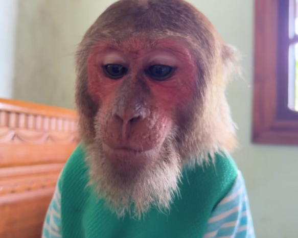 The baby monkey copied CUTIS perfectly — eyes huge, mouth trembling dramatically.