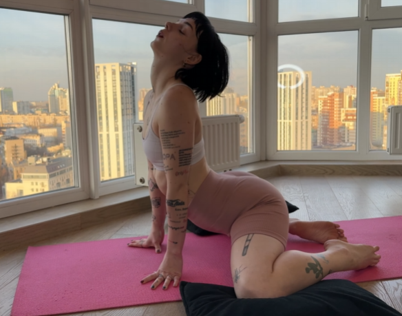 The movements were slow, like liquid. Her spine rippled gently, releasing stiffness accumulated during the night. Her breath guided her, connecting mind and body in a peaceful rhythm.
