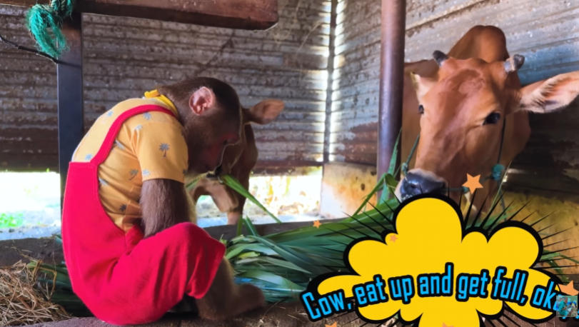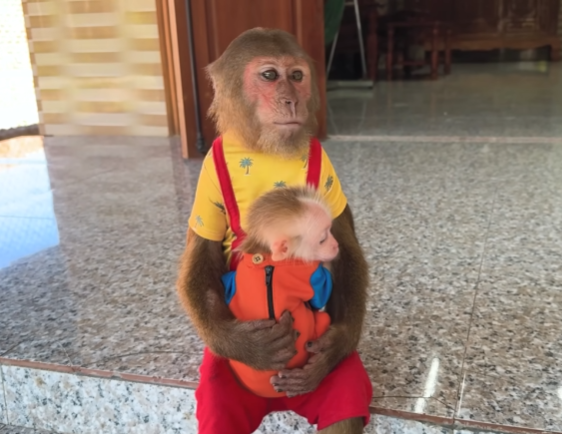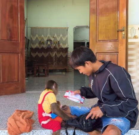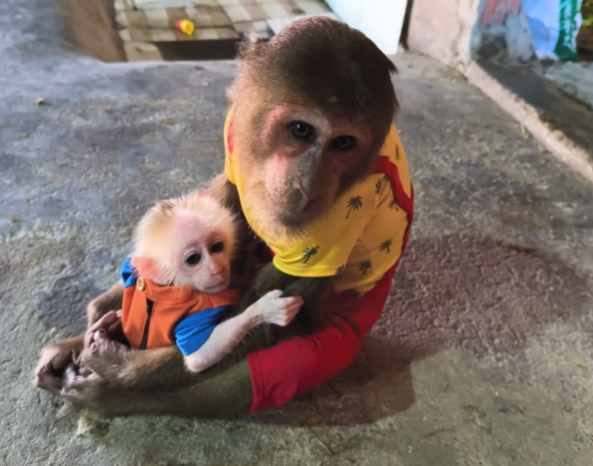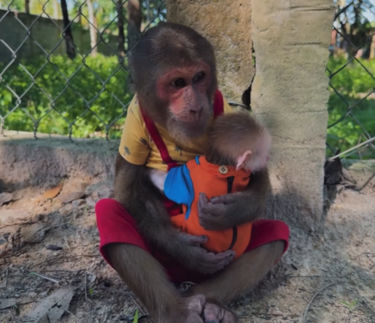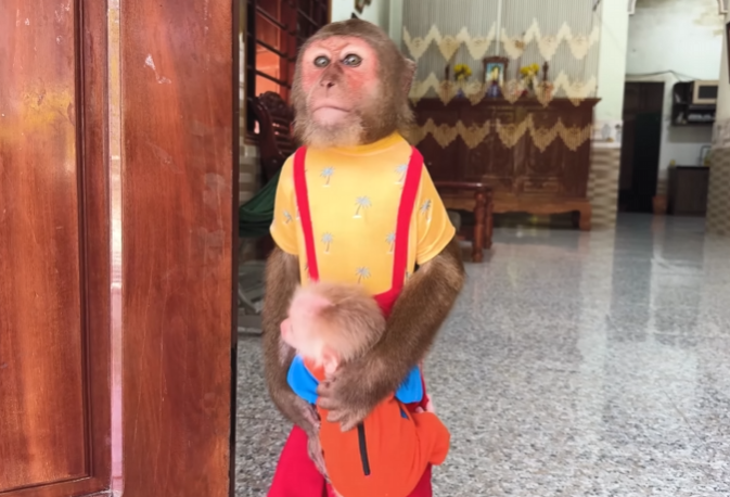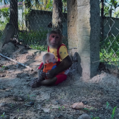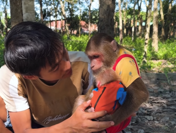 Baby Monkey puffed out his chest proudly, his earlier fear forgotten. He climbed onto CUTIS’s shoulder and tapped his cheek gently—almost like a thank you.