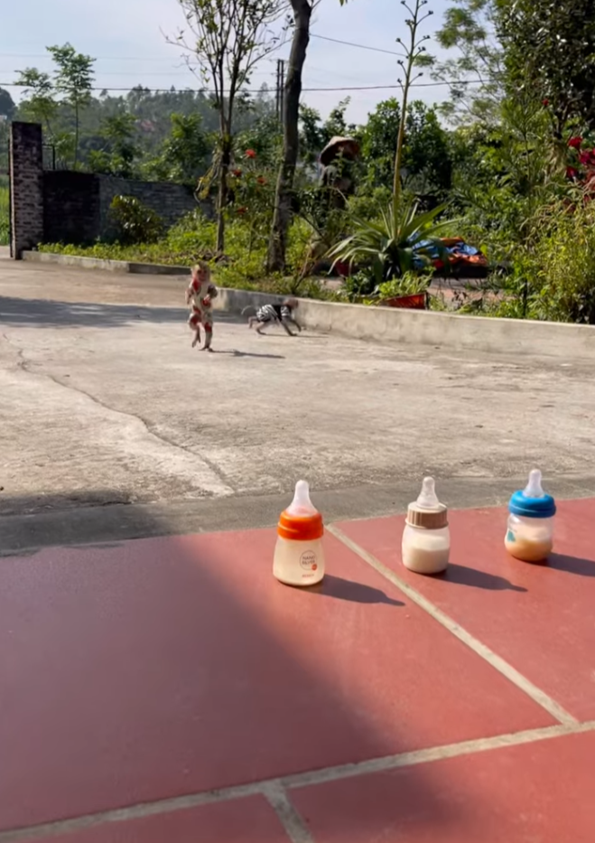 But Susu wasn’t satisfied with just drinking. He wanted to prove how smart he was. He carefully set the bottle down beside him, wiped milk off his mouth, and stood up tall.