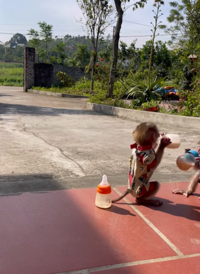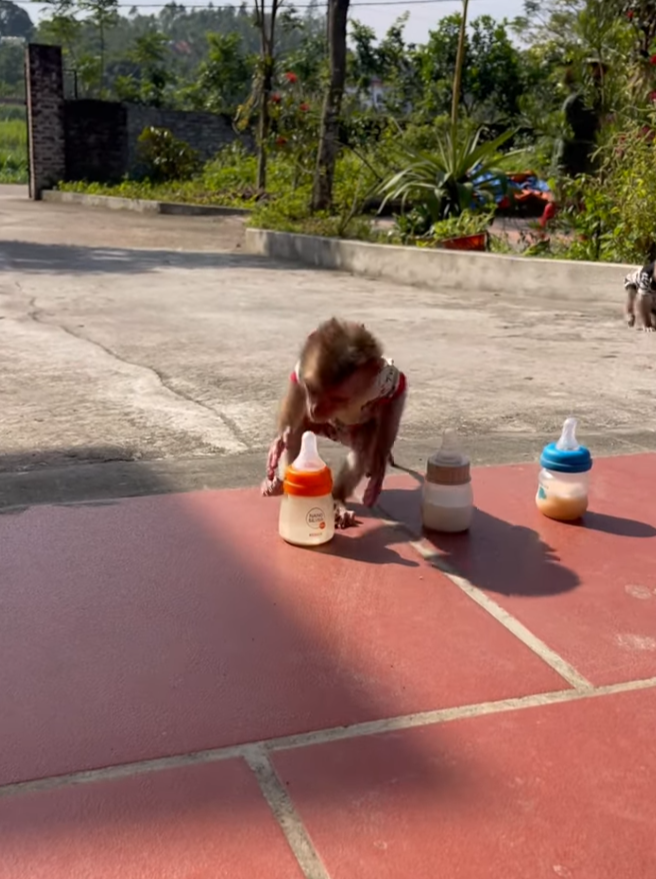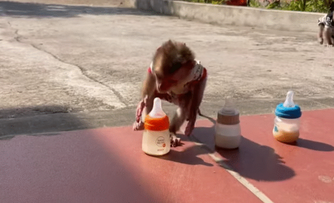 Mother Monkey knelt down, took the bottle gently, and twisted the cap open with ease. A soft click sounded, and the sweet smell of warm milk drifted into the air.